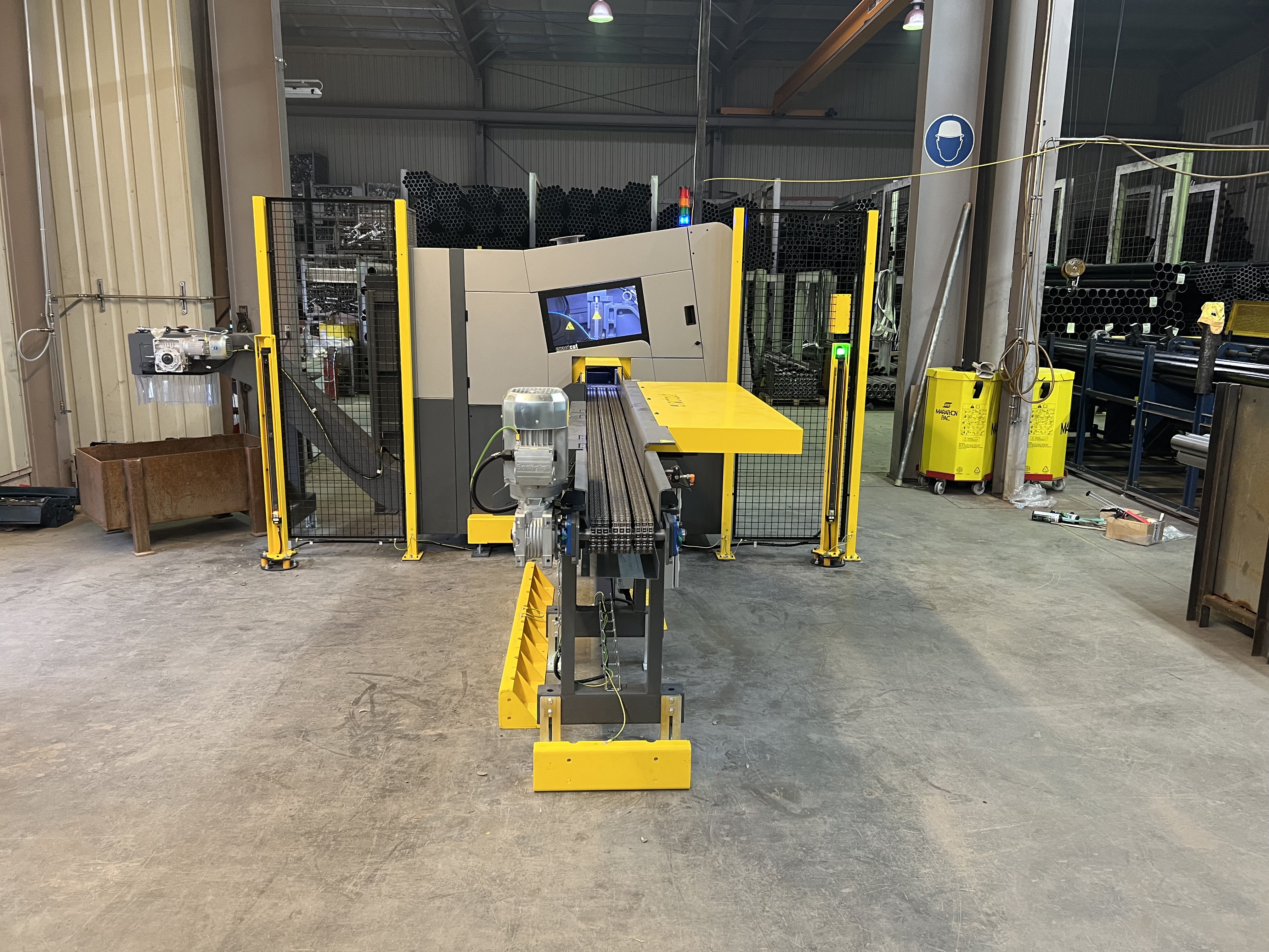 Die Maschine hat ein 6 m Lademagazin und einen 2 m langen Entsorgungstisch. Das Material wird selbsttätig in die Maschine geführt und die abgesägten Teile anschließend in unterschiedliche Boxen abtransportiert.